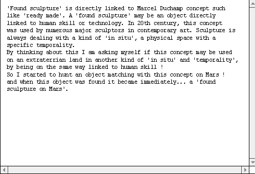 ATTENTION! This object is situated outside the MARS EXHIBITION SITTE and is not meant for transportation. If you ever have the chance to visit other regions of the red planet, don't miss 'Found Sculpture on Mars'.